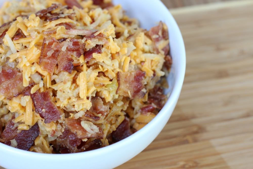 Shred cheese and apples. Chop bacon. Add finished onions, bacon, grated cheese and apples in medium bowl and mix together well.
