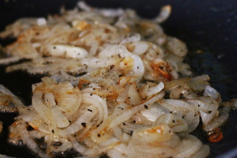 Heat 1 Tbl. butter in a saucepan over medium heat. Add onions and salt and cook until they begin to caramelize (could take around 15 minutes), stirring occasionally. Once they start to caramelize, add honey and cracked pepper continuing to cook until golden and translucent.